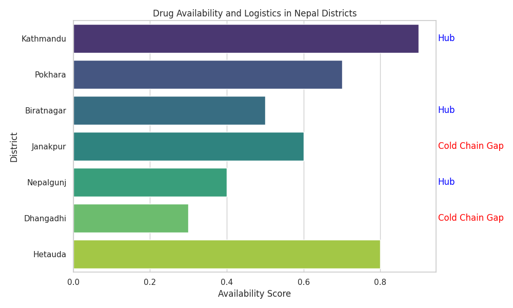 A bar-style heat map of major districts in Nepal, annotated with logistics hubs and cold chain gaps. This highlights where Himalayan Family House can intervene with decentralized storage and regenerative supply systems.