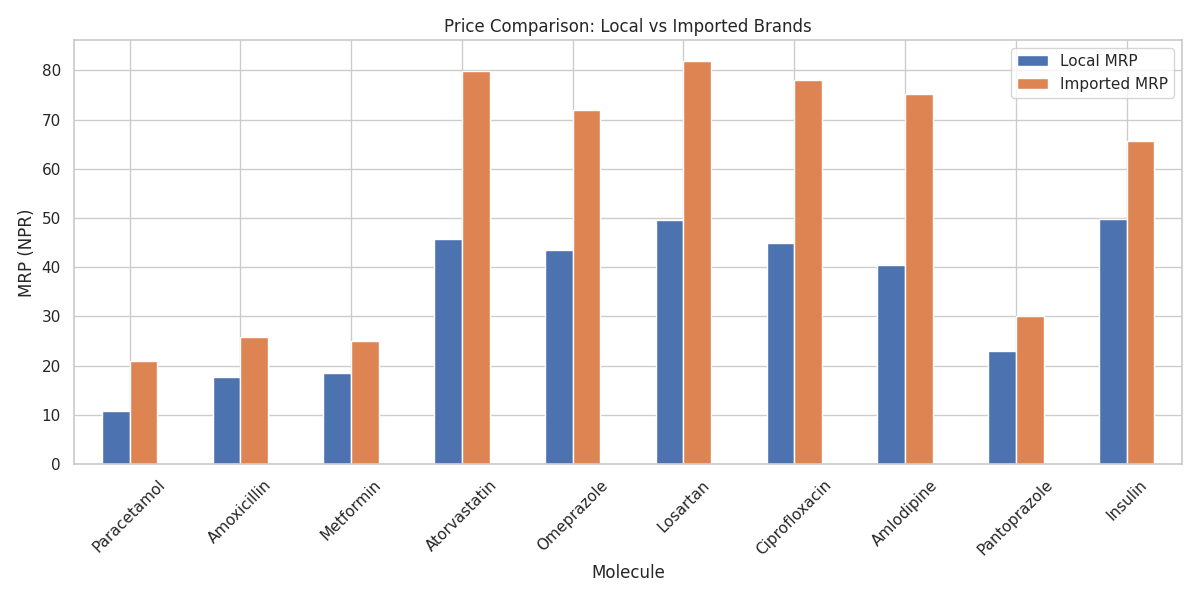 | Drug | Local Price (NPR) | Imported Price (NPR) | Price Difference |